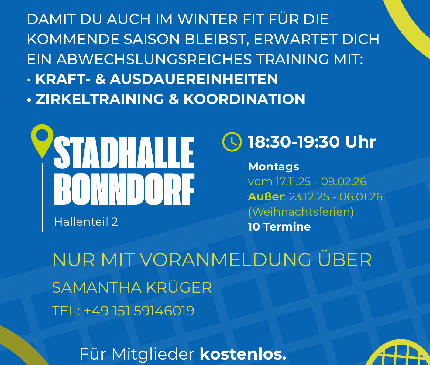 Unter dem Motto „FIT 4 SEASON“ bieten wir allen Mitgliedern (ab 16 Jahren) ein gezieltes Kraft-, Ausdauer- und Koordinationstraining an. In diesem Kurs legen wir das körperliche Fundament für den Frühling – ohne Schläger, aber mit vollem Einsatz!